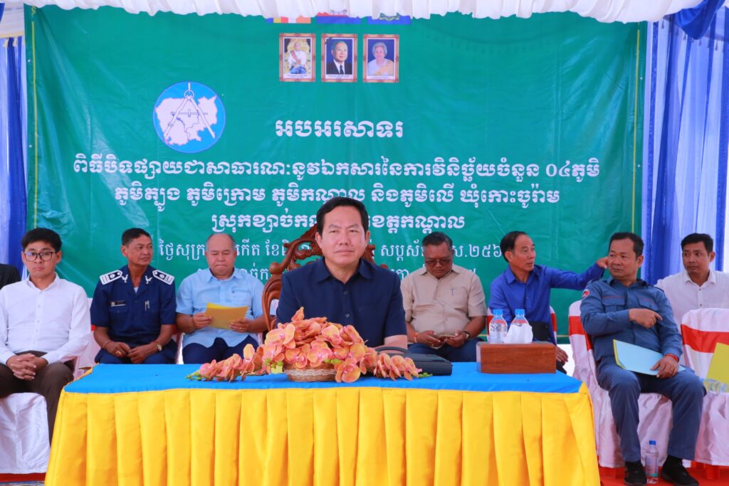 ++++++++++ខេត្តកណ្តាល៖ ឯកឧត្តម តាំង ម៉េងលាន អភិបាលរងខេត្តកណ្តាល បានមានប្រសាសន៍ក្នុងពិធីបិទផ្សាយជាសាធារណៈនូវឯកសារ នៃការវិនិច្ឆ័យដីធ្លីការចុះបញ្ជីដីធ្លីមានលក្ខណៈជាប្រព័ន្ធថា៖ការបិទផ្សាយនេះគឺពិតជាមានសារៈសំខាន់ណាស់ ព្រោះដើម្បីទុកពេលឱ្យប្រជាពលរដ្ឋម្ចាស់ដី មកពិនិត្យផ្ទៀងផ្ទាត់មើលពីភាពត្រឹមត្រូវពិតប្រាកដលើដីរបស់ខ្លួន ហើយការចុះបញ្ចីដីធ្លីមានលក្ខណៈជាប្រព័ន្ធនេះ ពិតជាអនុវត្តតាមនីតិវិធីដែលបានកំណត់ដោយច្បាប់ និងបច្ចេកវិទ្យាទំនើប មានតម្លាភាព និងការទទួលខុសត្រូវ ដែលប្រទេសជឿនលឿនលើពិភពលោកកំពុងអនុវត្ត និងមានប្រសិទ្ធិភាពលើការគ្រប់គ្រងដីធ្លី។នេះជាការសមស្របបំផុតដែលបានកំណត់នៅក្នុងគោលនយោបាយដីធ្លីរបស់រាជរដ្ឋាភិបាលដើម្បីលើកស្ទួយដល់ការអភិវឌ្ឍន៍របស់ប្រទេសជាតិ ជាប្រយោជន៍ដល់រាជរដ្ឋាភិបាល និងប្រជាពលរដ្ឋជាម្ចាស់ដី។ ក្នុងឱកាសនោះដែរ ឯកឧត្តមអភិបាលរងខេត្ត៖ បានកោតសរសើរដល់មន្ទីររៀបចំដែនដី នគរូបនីយកម្ម សំណង់ និងសុរិយោដី ខេត្តកណ្តាល ដែលបានខិតខំប្រឹងប្រែងក្នុងការចុះកំណត់ព្រំ វាស់វែង និងវិនិច្ឆ័យ ចំនួន ០៤ភូមិ គឺភូមិត្បូង ភូមិក្រោម ភូមិកណ្តាល និងភូមិលើ ឃុំកោះចូរ៉ាម ស្រុកខ្សាច់កណ្តាល សម្រេចបានជាផ្លែផ្កាដែលមានក្បាលដីចំនួន៣,៦៤១ក្បាលដី។ ឯកឧត្តមបានលើកឡើងបន្ថែមថា៖ មុនឈានដល់ការសម្រេចចេញវិញ្ញាបនបត្រសម្គាល់ម្ចាស់អចលនវត្ថុ (ប័ណ្ណកម្មសិទ្ធិ) នីមួយៗ គឺមានការងារច្រើនណាស់ដែលទាមទារនូវការខិតខំប្រឹងប្រែងរបស់មន្ទីររៀបចំដែនដី នគររូបនីយកម្ម សំណង់ និងសុរិយោដីខេត្ត មន្ទីរ ស្ថាប័នពាក់ព័ន្ធ រួមទាំងអាជ្ញាធរមូលដ្ឋាន និងការចូលរួមពីសំណាក់ប្រជាពលរដ្ឋដែលជាម្ចាស់ដី និងអ្នកកាន់កាប់ដីទាំងអស់ ទាំងដីរដ្ឋ និងដីឯកជន។ ដោយឡែក អាជ្ញាធរមូលដ្ឋានមានតួនាទីយ៉ាងសំខាន់ក្នុងដំណើរការចុះបញ្ជីដីធ្លីមានលក្ខណៈជាប្រព័ន្ធ ដោយជួយធ្វើការបញ្ជាក់នូវលិខិតស្នាមផ្សេងៗដែលពាក់ព័ន្ធនឹងអត្តសញ្ញាណម្ចាស់ដី អត្តសញ្ញាណក្បាលដី និងជួយធ្វើការផ្សព្វផ្សាយអោយបានទូលំទូលាយជូនដល់ប្រជាពលរដ្ឋ ដែលជាម្ចាស់ដី និងអ្នកកាន់កាប់ដី ដើម្បីអោយពួកគាត់មកចូលរួមក្នុងការពិនិត្យផ្ទៀងផ្ទាត់ក្បាលដីរបស់ខ្លួនអោយបានគ្រប់គ្នា ក្នុងកំឡុងពេលបិទផ្សាយទិន្នន័យជាសាធារណៈនូវឯកសារនៃការវិនិច្ឆ័យ ដើម្បីធានាបាននូវភាពសុក្រឹត្យត្រឹមត្រូវក្នុងការចេញប័ណ្ណកម្មសិទិ្ធជូនពួកគាត់។ លោក ព្រំ ឆាត អនុប្រធានមន្ទីររៀបចំដែនដីនគររូបនីយកម្មសំណង់ និងសុរិយោដីខេត្តកណ្ដាល បានថ្លែងថា៖តាមរយៈការបិទផ្សាយទិន្នន័យនាព្រឹកនេះ សូមអោយបងប្អូនប្រជាពលរដ្ឋទាំងអស់ ដែលជាម្ចាស់ដី អ្នកកាន់កាប់ដី និងអ្នកពាក់ព័ន្ធ មក