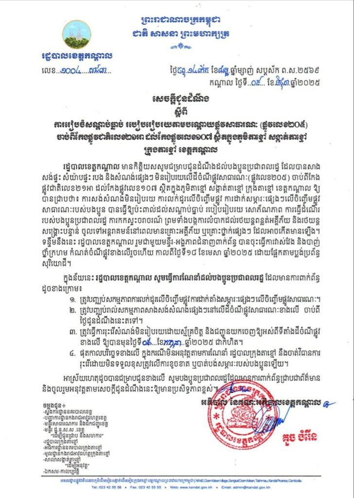 ++++++++++ខេត្តកណ្តាល៖ ប្រជាពលរដ្ឋក្នុងភូមិតាខ្មៅ សង្កាត់តាខ្មៅ ក្រុងតាខ្មៅបានគាំទ្រ និងយល់ព្រមសហការណ៏ជាមួយអាជ្ញាធរ ក្នុងការរៀបចំសណ្តាប់ធ្នាប់ របៀបរៀបរយតាមបណ្តោយផ្លូវសាធារណៈ (ផ្លូវលេខ២០៥) ចាប់ពីរីកែងផ្លូវជាតិលេខ២១អា ដល់កែងផ្លូវលេខ១០៧ ។ ការគាំទ្រនេះ បានធ្វើឡើងនៅក្នុងកិច្ចប្រជុំ ផ្សព្វផ្សាយសេចក្តីជូនដំណឹង លេខ១០០៤ ស.ជ.ណ ចុះថ្ងៃទី៩ ខែមិថុនា ឆ្នាំ២០២៥ របស់រដ្ឋបាលខេត្តកណ្ដាល ស្តីពីការរៀបចំសណ្តាប់ធ្នាប់ របៀបរៀបរយតាមបណ្តោយផ្លូវសាធារណៈ (ផ្លូវលេខ២០៥) ចាប់ពីរីកែងផ្លូវជាតិលេខ២១អា ដល់កែងផ្លូវលេខ១០៧ ស្ថិតក្នុងភូមិតាខ្មៅ សង្កាត់តាខ្មៅ ក្រុងតាខ្មៅ ដែលបានដឹកនាំកិច្ចប្រជុំដោយ ឯកឧត្តម ណុប ដារ៉ា អភិបាលរងខេត្តកណ្តាល នាព្រឹកថ្ងៃទី១ ខែកក្កដា ឆ្នាំ២០២៥ នៅសាលប្រជុំសាលាខេត្តកណ្ដាល។ឯកឧត្តម ណុប ដារ៉ា បានមានប្រសាសន៍ថា កិច្ចប្រជុំផ្សព្វផ្សាយនាថ្ងៃនេះ គឺជាកិច្ចប្រជុំដ៏មានសារៈសំខាន់មួយដែលរដ្ឋបាលខេត្តកណ្តាល បានរៀបចំឡើងដើម្បីផ្សព្វផ្សាយ និងពន្យល់ណែនាំដល់បងប្អូនប្រជាពលរដ្ឋដែលរស់នៅតាមបណ្ដោយផ្លូវខាងលើចូលរួមសហការ សំដៅរួមគ្នាធ្វើឱ្យក្រុងរបស់យើងមានសណ្តាប់ធ្នាប់ មានរបៀបរៀបរយ មិនប៉ះពាល់ដល់សោភណ្ឌភាព និងប្រយោជន៍សាធារណៈ។ ឯកឧត្តមអភិបាលរងខេត្ត បានមានប្រសាសន៍ថា ការសង់សំណង់មិនរៀបរយ ការលក់ដូរលើចិញ្ចើមផ្លូវ ការដាក់សម្ភារៈផ្សេងៗលើចិញ្ចើមផ្លូវសាធារណៈរបស់បងប្អូន គឺពិតជាបានធ្វើឱ្យមានផលប៉ះពាល់ដល់សណ្តាប់ធ្នាប់របៀបរៀបរយយ៉ាងខ្លាំង ធ្វើឱ្យទីក្រុងគ្មានសោភ័ណភាព ជាពិសេសនោះគឺបានបង្កឱ្យមានការកកស្ទះចរាចរណ៍ ព្រមទាំងបង្កការលំបាកដល់រថយន្តពន្លត់អគ្គីភ័យ និងរថយន្តសង្គ្រោះបន្ទាន់ ចូលទៅអន្តរាគមន៍នៅពេលមានគ្រោះអគ្គីភ័យ ឬគ្រោះថ្នាក់ផ្សេងៗ ដែលអាចកើតមានឡើងផងដែរ។ ឯកឧត្ដមអភិបាលរងខេត្ត បន្តទៀតថា ផ្អែកតាមខ្លឹមសារសេចក្តីជូនដំណឹងខាងលើនេះ រដ្ឋបាលខេត្តកណ្តាល សូមធ្វើការណែនាំដល់បងប្អូនប្រជាពលរដ្ឋ ដែលមានការពាក់ព័ន្ធ ដូចខាងក្រោម៖១. ត្រូវបញ្ឈប់សកម្មភាពការលក់ដូរលើចិញ្ចើមផ្លូវការដាក់តាំងសម្ភារៈផ្សេងៗលើចិញ្ចើមផ្លូវសាធារណៈ។ ២. ត្រូវបញ្ឈប់រាល់សកម្មភាពសាងសង់សំណង់ផ្សេងៗនៅលើដីចំណីផ្លូវសាធារណៈខាងលើ ចាប់ពី ថ្ងៃជូនដំណឹងនេះតទៅ។ ៣. ត្រូវធ្វើការរុះរើសំណង់មិនរៀបរយដោយស្ម័គ្រចិត្ត និងជញ្ជូនយកចេញឱ្យអស់ពីទីតាំងដីចំណីផ្លូវ ខាងលើ ឱ្យបានមុនថ្ងៃទី៩ ខែកក្កដា ឆ្នាំ២០២៥ ជាកំហិត។ ៤. ផុតកាលបរិច្ឆេទខាងលើ ក្នុងករណីមិនអនុវត្តតាមការណែនាំ រដ្ឋបាលក្រុងតាខ្មៅ នឹងចាត់វិធានការ រុះរើដោយមិនទទួលខុសត្រូវលើការខូចខាត ឬបាត់បង់សម្ភារៈរបស់បងប្អូនឡើយ។ឯកឧត្ដមអភិបាលរងខេត្ត 