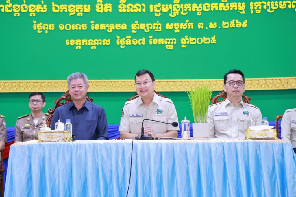 ++++++++++++ខេត្តកណ្តាល៖ ឯកឧត្តម ឌិត ទីណា រដ្ឋមន្ត្រីក្រសួងកសិកម្ម រុក្ខាប្រមាញ់ និងនេសាទ ឯកឧត្តម គួច ចំរើន អភិបាល នៃគណៈអភិបាលខេត្តកណ្តាល និងឯកឧត្តម កែវ អូម៉ាលីស្ស រដ្ឋលេខាធិការក្រសួងកសិកម្ម រុក្ខាប្រមាញ់ និងនេសាទ នៅព្រឹកថ្ងៃទី១៧ ខែកញ្ញា ឆ្នាំ២០២៥នេះ បានអញ្ជើញជាអធិបតី ក្នុងពិធីសំណេះសំណាលជាមួយមន្ត្រីកសិកម្មឃុំ-សង្កាត់ ក្នុងភូមិសាស្ត្រខេត្តកណ្តាល ដោយមានការចូលរួមពីអាជ្ញាធរក្រុង-ស្រុក មន្ទីរពាក់ព័ន្ធ និងមន្ត្រីកសិកម្មឃុំ-សង្កាត់ជាច្រើនរូប។ ឯកឧត្តម គួច ចំរើន បានមានប្រសាសន៍ថា ពិធីសំណេះសំណាលនេះ គឺពិតជាមានសារៈសំខាន់ណាស់ ស្របពេលដែលរាជរដ្ឋាភិបាល កំពុងបន្តយកចិត្តទុកដាក់ខ្ពស់បំផុត ក្នុងការដោះស្រាយជម្លោះព្រំដែនកម្ពុជា-ថៃ និង ខិតខំជំរុញឱកាសការងារក្នុងស្រុក។ ឯកឧត្តមអភិបាលខេត្ត បានបន្តថា ពិធីសំណេះសំណាលនេះ ក៏ជាការលើកទឹកចិត្ត យ៉ាងធំធេងប្រកបដោយភាពកក់ក្តៅ ចំពោះមន្ត្រីកសិកម្មទូទាំងខេត្ត និងជាសក្ខីភាព នៃការយកចិត្តទុកដាក់របស់ ឯកឧត្តមរដ្ឋមន្ត្រី ក្នុងការអភិវឌ្ឍប្រទេសជាតិ ជាពិសេសក្នុងការធ្វើទំនើបកម្មវិស័យកសិកម្ម ដើម្បីឱ្យវិស័យនេះកាន់តែមានភាពប្រកួតប្រជែង មានបរិយាបន្ន ធន់នឹងការប្រែប្រួលអាកាសធាតុ និងមាននិរន្តរភាព ដើម្បីចូលរួម ចំណែកសម្រេចចក្ខុវិស័យប្រែក្លាយប្រទេសកម្ពុជា ជាប្រទេសមានប្រាក់ចំណូលមធ្យម កម្រិតខ្ពស់នៅឆ្នាំ២០៣០ និងជាប្រទេសមានប្រាក់ចំណូលខ្ពស់នៅឆ្នាំ២០៥០។ឯកឧត្តមអភិបាលខេត្ត បានបញ្ជាក់ថា រាជរដ្ឋាភិបាល នីតិកាលទី៧ នៃរដ្ឋសភា ក្រោមការដឹកនាំប្រកបដោយឧត្តមគតិ ស្វាហាប់ ឈ្លាសវៃ ម៉ត់ចត់ ប៉ិនប្រសប់ និងការប្តេជ្ញាចិត្តយ៉ាងមុតស្រួច របស់ សម្តេច មហាបវរធិបតី ហ៊ុន ម៉ាណែត នាយករដ្ឋមន្ត្រី នៃព្រះរាជាណាចក្រកម្ពុជា បន្តចាត់ទុក វិស័យកសិកម្មជាវិស័យអាទិភាពមួយ និងជាវិស័យស្នូលសម្រាប់ទ្រទ្រង់សេដ្ឋកិច្ចជាតិ ដោយបានកំណត់ការលើកស្ទួយកសិកម្ម ជាមុំទី៣ នៃបញ្ចកោណទី៤ ក្នុងយុទ្ធសាស្ត្របញ្ចកោណ ដំណាក់កាលទី១ ព្រមទាំងបានដាក់ចេញនូវកម្មវិធីគោលនយោបាយ អាទិភាពទី៥ និងទី៦ ផ្តោតលើការលើកស្ទួយផលិតកម្មកសិកម្ម រកទីផ្សារ និងរក្សាលំនឹង ថ្លៃកសិផល តាមរយៈកម្មវិធីហិរញ្ញប្បទាន ១០០ លានដុល្លារអាមេរិក ការដាក់ពង្រាយ មន្ត្រីកសិកម្មឃុំ-សង្កាត់ និងការអភិវឌ្ឍសហគមន៍កសិកម្មទំនើប ឆ្ពោះសម្រេចបាន គោលនយោបាយសាមញ្ញ ៤ ចំណុច គឺ «មានហូប មានប្រើ មានបាន និងមានរហូត»។ ឯកឧត្តមអភិបាលខេត្ត បានឱ្យដឹងថា ក្នុងឆ្នាំ២០២៤ ខេត្តកណ្តាលមានផលិតផលក្នុងស្រុកសរុប ៣៤១១ លានដុល្លារ ដែលវិស័យកសិកម្មបានចូលរួមចំណែករហូតដល់ទៅ ៣៧% ខ្ពស់ជាងវិស័យឧស្សាហកម្ម ដែលបានចូលរួមចំណែក ៣៦% និងវិស័យសេ