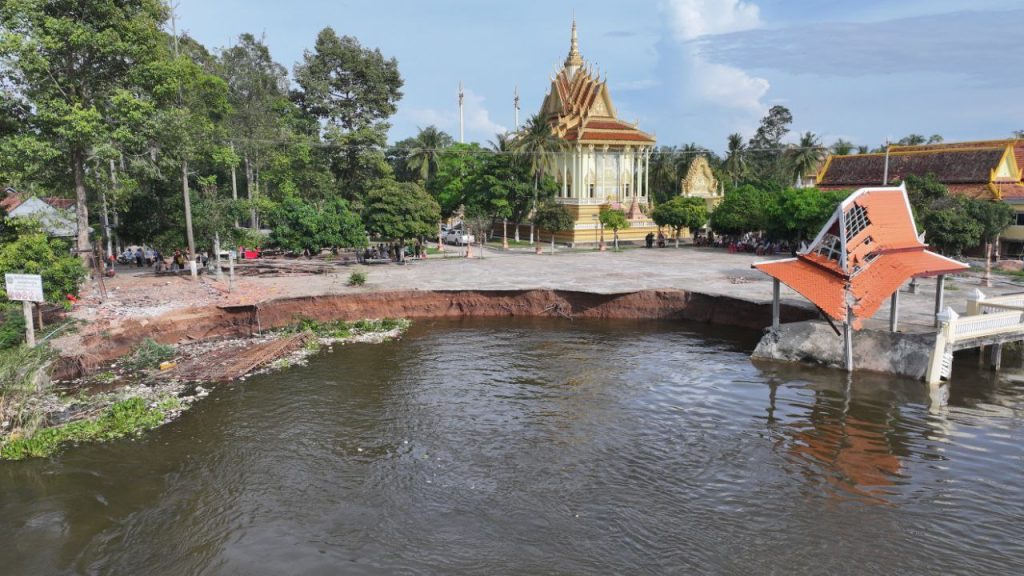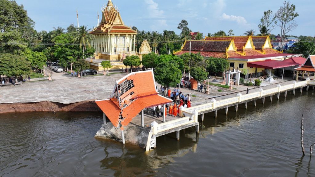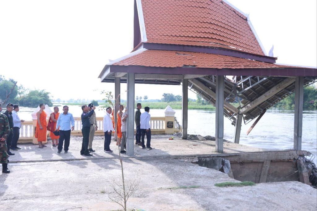 ----------------------------------------------------ខេត្តកណ្តាល៖ ច្រាំងមាត់ស្ទឹង ស្ថិតក្នុងឃុំលើកដែក រងការបាក់ស្រុត បណ្តាលមកពីទឹកទន្លេមេគង្គ និងទឹកទន្លេបាសាក់ហូរចូលតាមព្រែកលើកដែក មកប្រសព្វត្រង់ចំណុចមុខវត្តជ្រោយ ស្ថិតនៅក្នុងភូមិសាស្ត្រស្រុកកោះធំ នារសៀលថ្ងៃទី២១ ខែតុលា ឆ្នាំ២០២៥នេះត្រូវបាន ឯកឧត្តម គួច ចំរើន អភិបាល នៃគណៈអភិបាលខេត្តកណ្តាល ដឹកនាំមន្ទីរជំនាញ មន្ត្រីបច្ចេកទេស អាជ្ញាធរដែនដី ព្រះសង្ឃ និងប្រជាពលរដ្ឋចំណុះជើងវត្ត ចុះពិនិត្យជាក់ស្តែងទីតាំងមាត់ស្ទឹងលើកដែក ដែលរងការបាក់ច្រាំង នៅចំណុចវត្តជ្រោយ ភូមិអន្លង់ស្លាត ឃុំលើកដែក ស្រុកកោះធំ ខេត្តកណ្តាល។ តាមរបាយការណ៍ លោកអភិបាលស្រុកកោះធំ បានឱ្យដឹងថា៖ ទីតាំងដែលបានបាក់ស្រុតនេះ ស្ថិតនៅវត្តជ្រោយ ជាប់មាត់ស្ទឹងលើកដែក នៅពេលដែលទឹកពីទន្លេមេគង្គ និងទន្លេបាសាក់ហូរចូលតាមព្រែកលើកដែក មកប្រសព្វត្រង់ចំណុចមុខវត្តជ្រោយនេះ ធ្វើឱ្យចរន្តទឹកកួចវិល បណ្តាលឱ្យដីច្រាំងសឹករិចរិល ស្របពេលលូរំដោះទឹកភ្លៀងក្នុងវត្តបង្ហូរធ្លាក់ចំទីតាំងដែលបានបាក់ស្រុត ដែលជាផ្នែកមួយធ្វើឱ្យមានជម្រាបទឹកក្រោមដី បណ្តាលឱ្យមានការបាក់ស្រុតតែម្តង។ តាមរបាយការណ៍ដដែលបានបញ្ជាក់ថា៖ ហេតុការណ៍បាក់ស្រុតច្រាំងនេះបានបណ្តាល អោយច្រាំងស្ទឹងលើកដែកបាក់ស្រុតប្រវែង ៤០ម៉ែត្រ និងបាក់ចូលជម្រៅប្រហែល ២០ម៉ែត្រ ព្រមទាំងបង្កការខូចខាតរោងលោកតាធ្វើពីបេតុង ១ខ្នង ទំហំ ៤x៤, របងគ្រឹះ១២ ម៉ែត្រ, សាបបេតុង ២០x២០ម៉ែត្រ, កុដិឈើប្រក់ក្បឿង ទំហំ ៦x២៤, កញ្ចុះបេតុងប្រក់ក្បឿង ទំហំ ៤x៦, ជណ្ដើបេតុងចុះមាត់ស្ទឹងទំហំ ២x៦, ដើមរាំងភ្នំ ២ដើម, ដើមឈើទាល ៥ដើម និងដើមស្វាយ ២ដើម៕