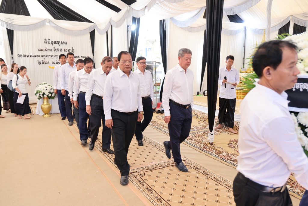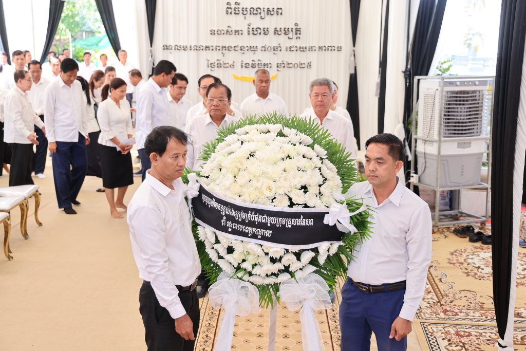 ++++++++++++++ខេត្តកណ្ដាល៖ ឯកឧត្តម នូ សាខន ប្រធានក្រុមប្រឹក្សាខេត្ត និងឯកឧត្តម គួច ចំរើន អភិបាល នៃគណៈអភិបាលខេត្តកណ្ដាល ព្រមទាំងមន្ទីរជុំវិញខេត្ត អាជ្ញាធរក្រុងតាខ្មៅ កងកម្លាំងមានសមត្ថកិច្ច នាព្រឹកថ្ងៃទី២៥ ខែវិច្ឆិកា ឆ្នាំ២០២៥នេះ បានអញ្ជើញចូលរួមក្នុងពិធីបុណ្យ និងគោរពវិញ្ញាណក្ខន្ធសព លោកស្រី ហែម សម្បត្តិ សមាជិកក្រុមប្រឹក្សាក្រុងតាខ្មៅ ដែលបានទទួលមរណភាព កាលពីថ្ងៃច័ន្ទ ទី២៤ ខែវិច្ឆិកា ឆ្នាំ២០២៥ វេលាម៉ោង វេលាម៉ោង ៥:២៤ នាទី ព្រឹក ក្នុងជន្មាយុ ៧០ឆ្នាំ ដោយរោគាពាធ គេហដ្ឋានសពស្ថិតនៅក្នុងភូមិបត្តាជី សង្កាត់ព្រែកហូរ ក្រុងតាខ្មៅ។ស្ថិតក្នុងពិធីដ៏ក្រៀមក្រំនេះ ឯកឧត្តមប្រធានក្រុមប្រឹក្សាខេត្ត និងឯកឧត្តមអភិបាលខេត្ត ព្រមទាំងប្រតិភូខេត្តកណ្តាល បានអញ្ជើញ អុជធូប ស្មិងស្មាធិ៍ គោរពឧទ្ទិសដល់ដួងវិញ្ញាណក្ខន្ធសព លោកស្រី ហែម សម្បត្តិ សូមឆាប់បានចាប់កំណើត ក្នុងសុគតិភពកុំបីឃ្លៀងឃ្លាតឡើយ ព្រមទាំងបានចូលរួមរំលែកទុក្ខយ៉ាងក្រៀមក្រំ និងអាឡោះអាល័យជាមួយក្រុមគ្រួសារនៃសពផងដែរ។ឯកឧត្តមទាំងពីរបានថ្លែងនូវការសោកស្តាយចំពោះ មរណភាពរបស់លោកស្រី ដែលជាការបាត់បង់នូវមាតា និងជីដូន ជាទីគោរពស្រឡាញ់ដ៏ជ្រាលជ្រៅប្រកបដោយព្រហ្មវិហារធម៌ ដែលបានប្រឹងប្រែងអស់កម្លាំងកាយ ចិត្ត បញ្ញា ស្មារតី ប្រកបដោយទឹកចិត្តស្វាមីភក្តី ចំពោះជាតិ និងតួនាទីរបស់ខ្លួនប្រកបដោយស្មារតីទទួលខុសត្រូវខ្ពស់។ បន្ទប់មក ឯកឧត្តមអភិបាលខេត្ត ក៍បានអញ្ជើញសរសេរសារក្នុងសៀវភៅរំលែកមរណទុក្ខ ដោយបានរៀបរាប់ពីការសោកស្តាយជាពន់ពេក ចំពោះមរណភាពរបស់លោកស្រី ហែម សម្បត្តិ។